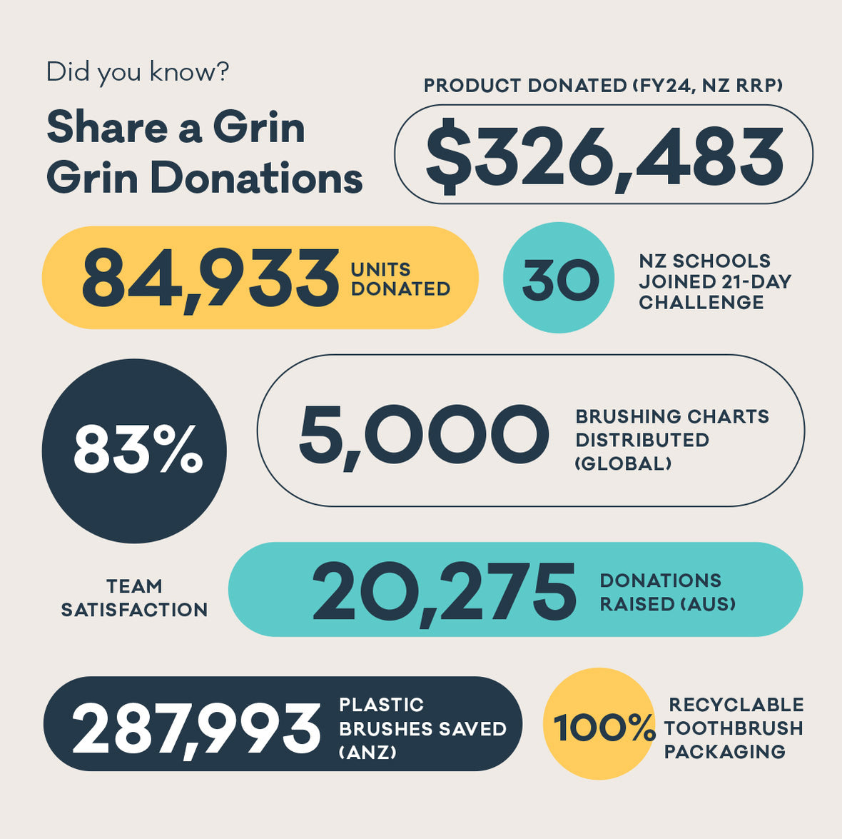 At Grin, we’re dedicated to making a positive difference beyond our products. Through our Share A Grin initiative, we proudly commit 2% of our global revenue to support charities and schools, ensuring essential oral care and education reach those who need it most.We believe true impact comes from connection - empowering communities with the tools and knowledge for healthier smiles and brighter futures. Giving back isn’t just part of our business; it’s at the heart of who we are.Learn more about Share A Grin here (link to Share A Grin page)