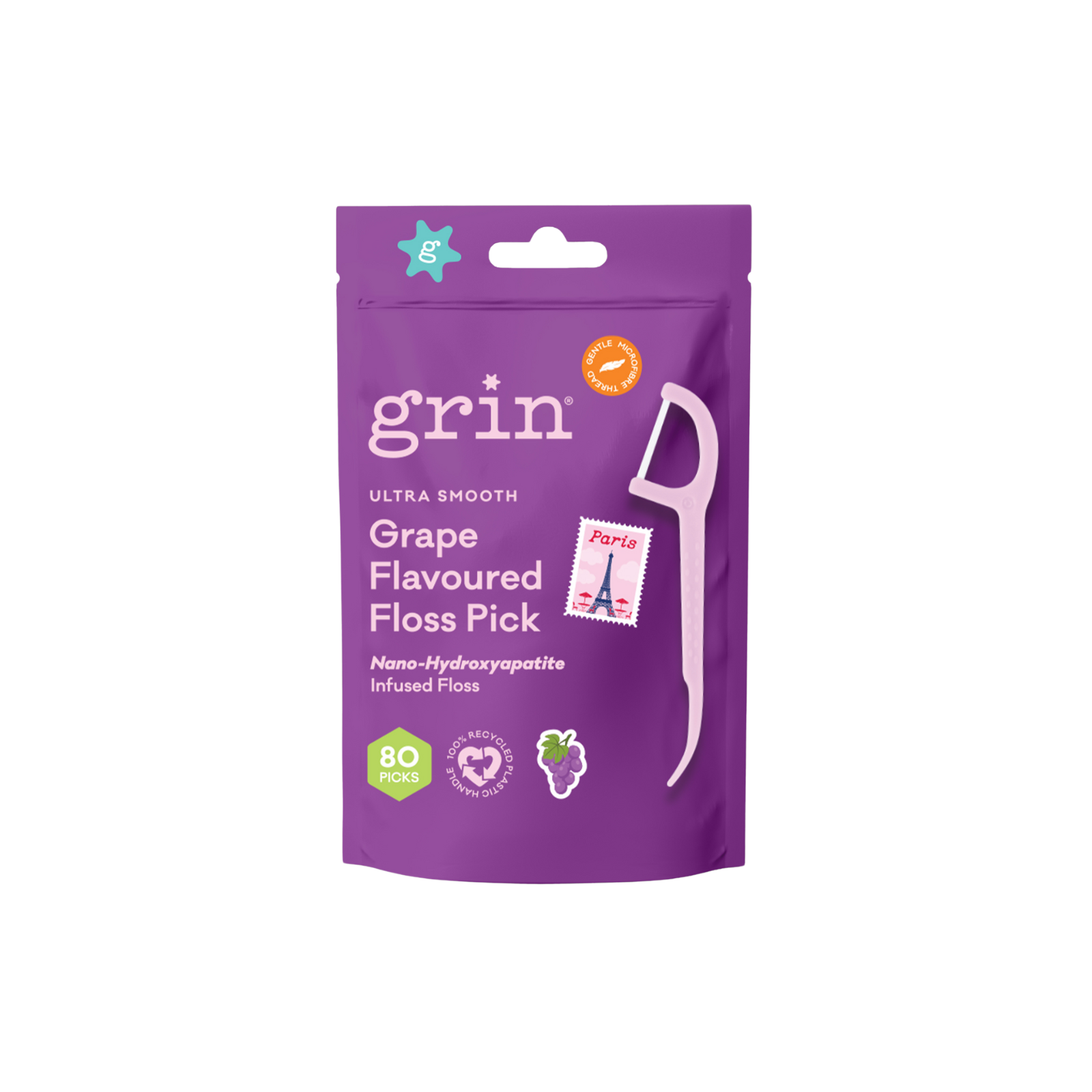 100% Recycled Plastic Handle Premium UHMW PE Floss, PEG (Polyethylene Glycol), Grape Flavour, Mint Flavour, Nano-Hydroxyapatite, Stevia Extract