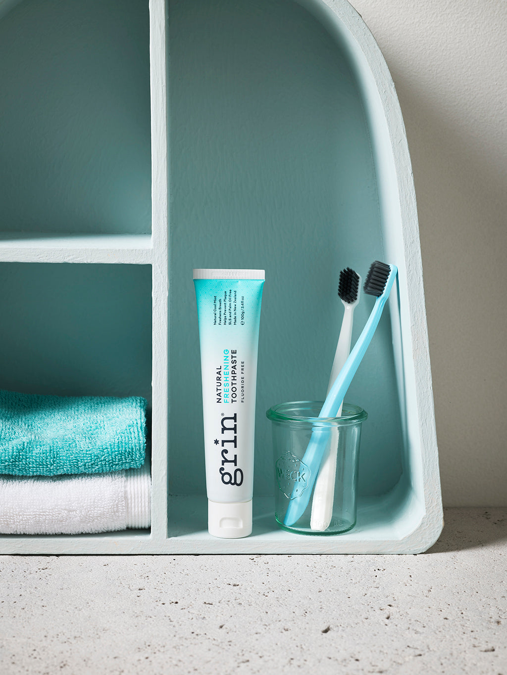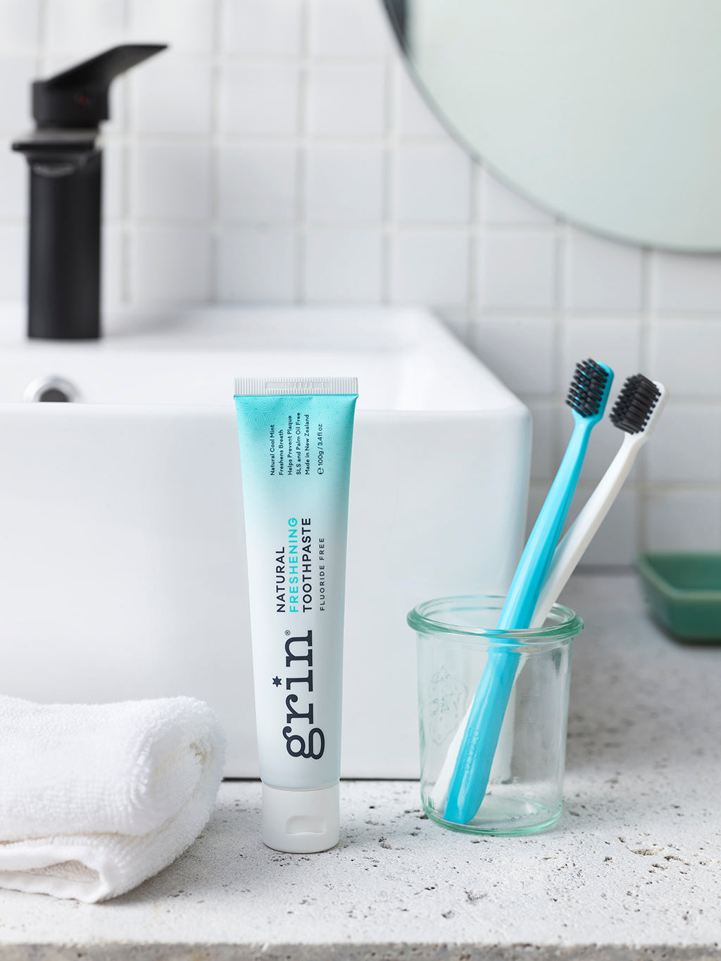 Grin’s natural Freshening toothpaste delivers you a thorough, fresh clean – without the need for harsh chemicals! The active ingredients; Manuka Oil, Propolis and Organic Sea Salt offer natural antiseptic and anti-inflammatory properties to keep bacteria in check, while natural spearmint, peppermint and fennel extracts leave your mouth minty fresh.