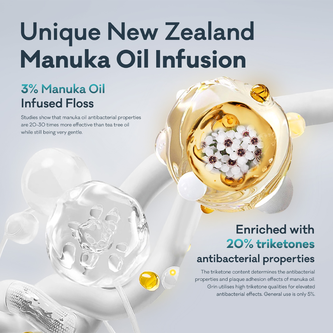- Manuka oil-infused floss fights bacteria and helps reduce plaque