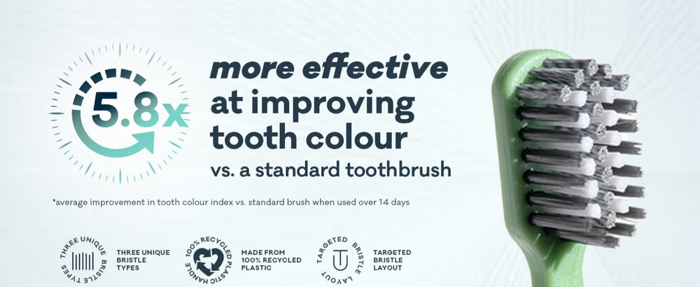 100% Recycled Plastic, Nylon Bristles, Charcoal-Infused Bristles.